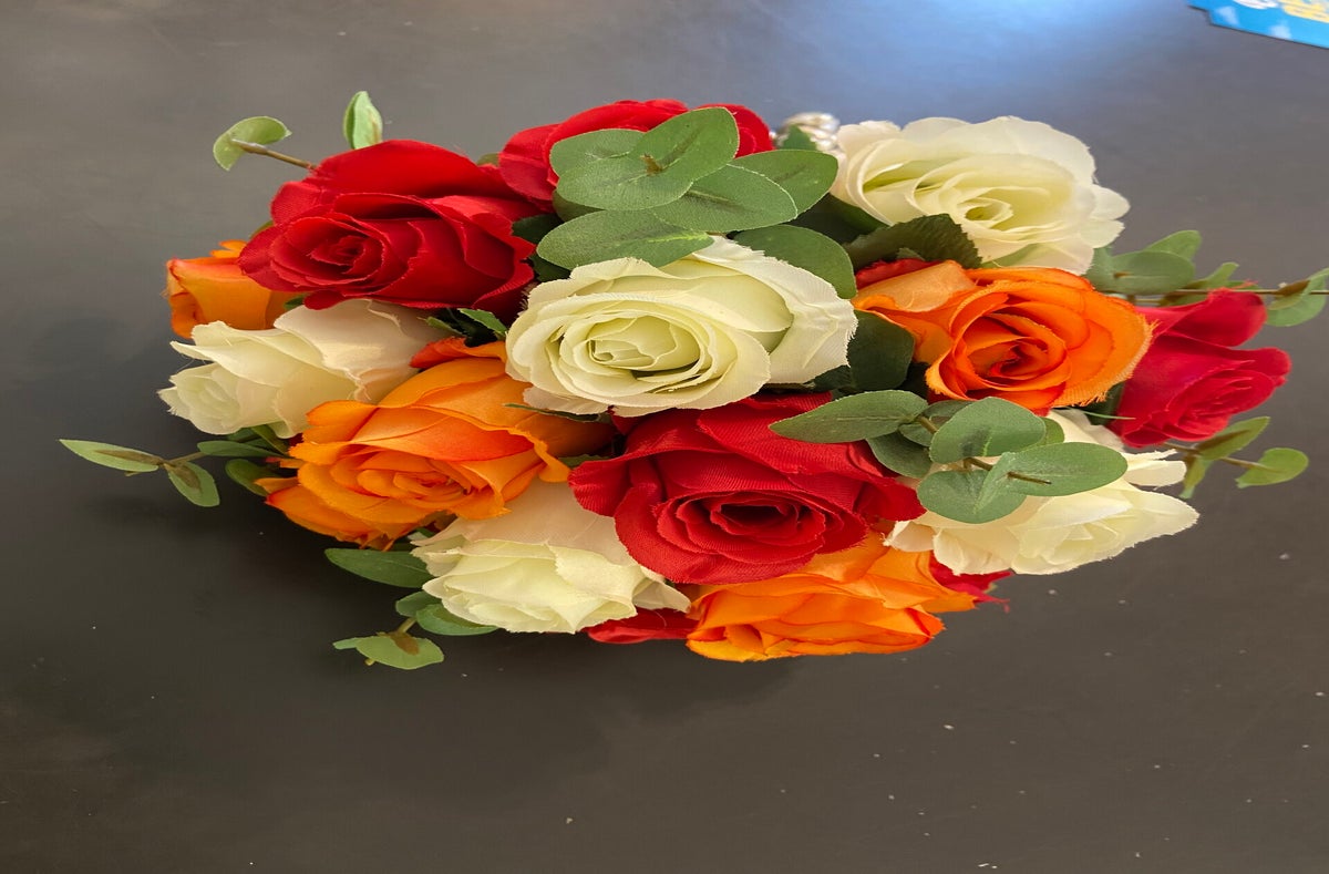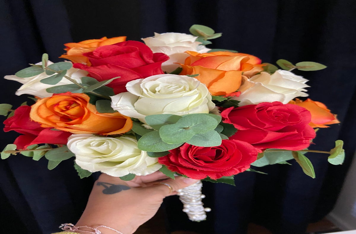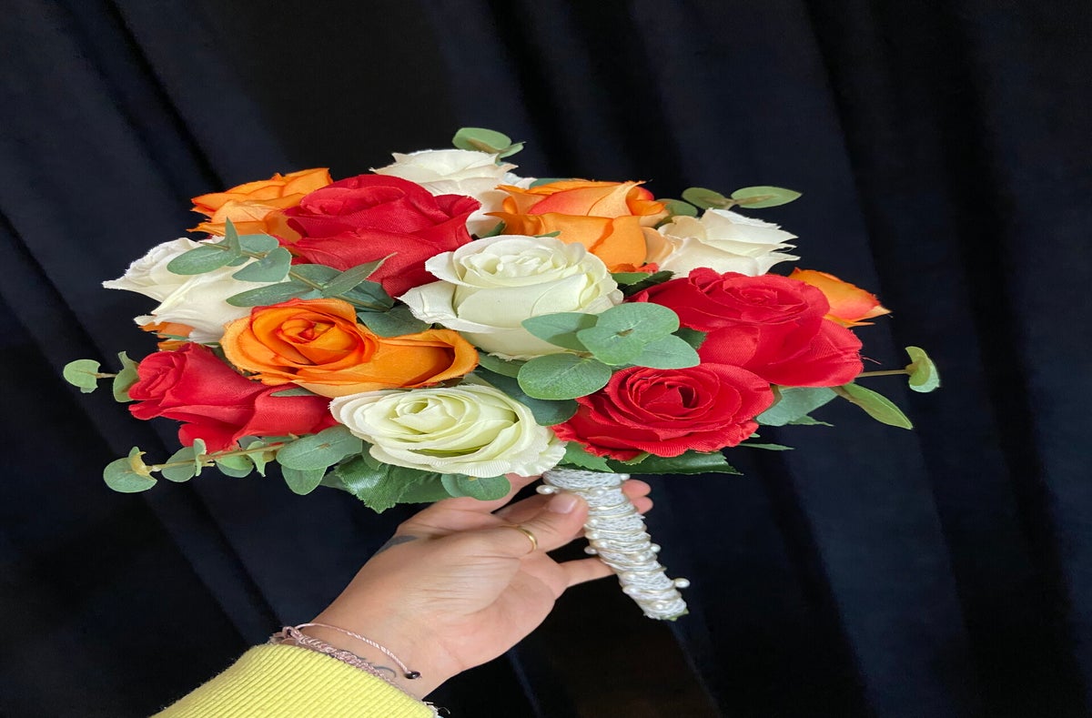 Boeketje met de warme gewenste kleuren van de bruid en eucalyptus.