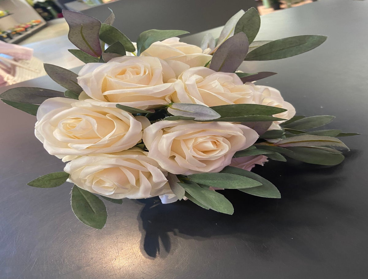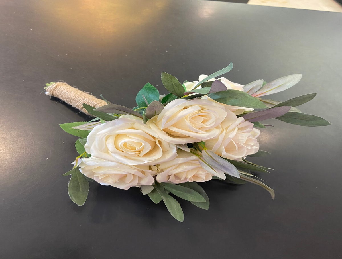 Boeketje met vanille rozen en olijftakken met touw gebonden.