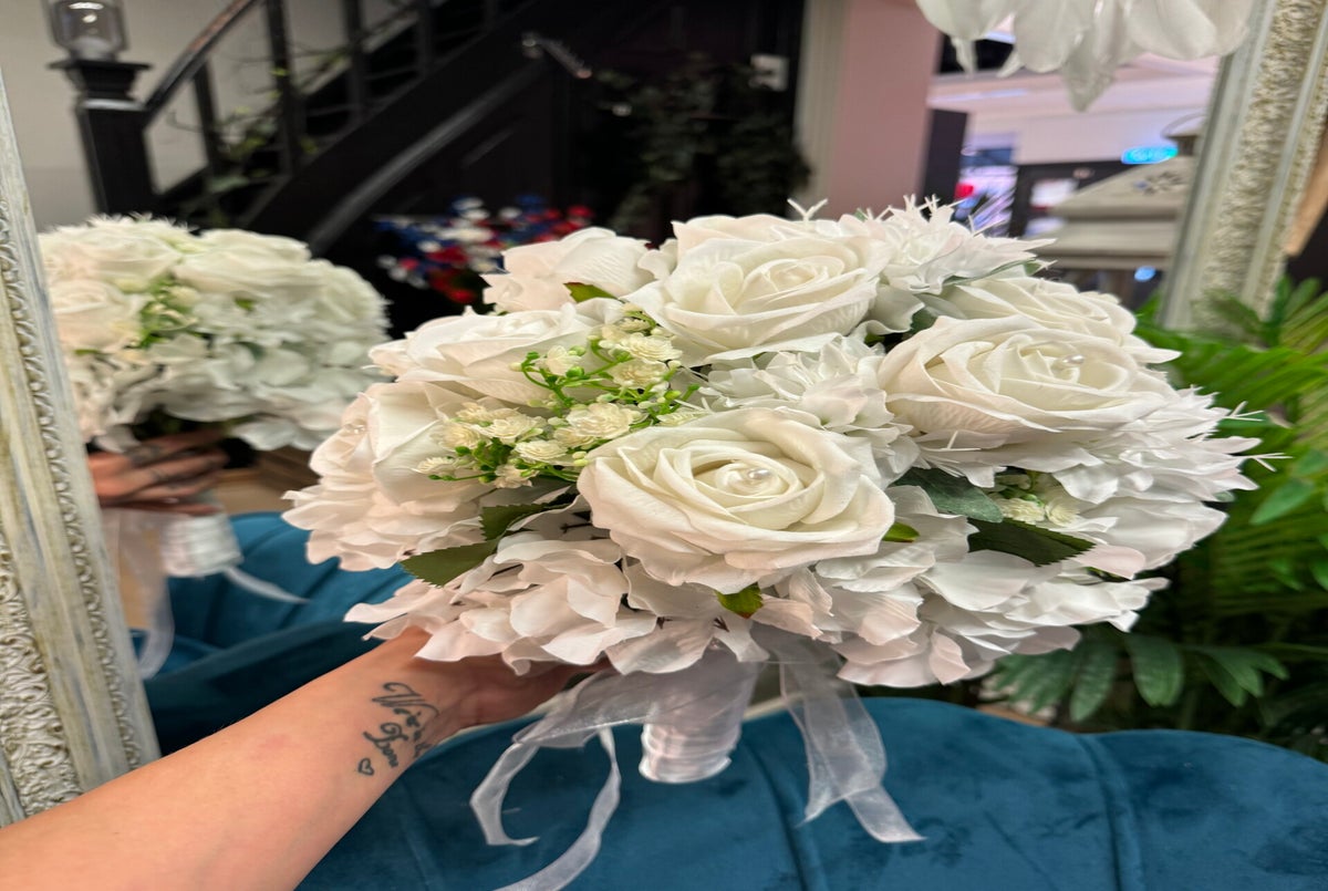 Bruidsboeket met witte rozen , gipskruid en pareltjes